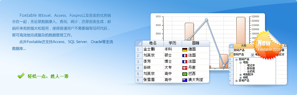 Foxtable將Excel、Access和Foxpro的優(yōu)勢(shì)融合在一起,并獨(dú)有層級(jí)數(shù)據(jù)管理功能,普通用戶不需要編寫任何代碼,即可完成各種復(fù)雜的數(shù)據(jù)管理工作,真正做到拿來(lái)即用。